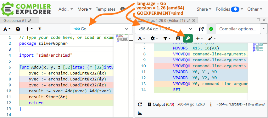 To manually set the options of Compiler Explorer: select Go language with compiler version x86-64 gc 1.26.0 + set the environment variable GOEXPERIMENT=simd using the Overrides (spanner) button.